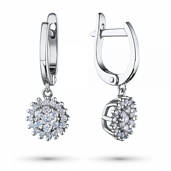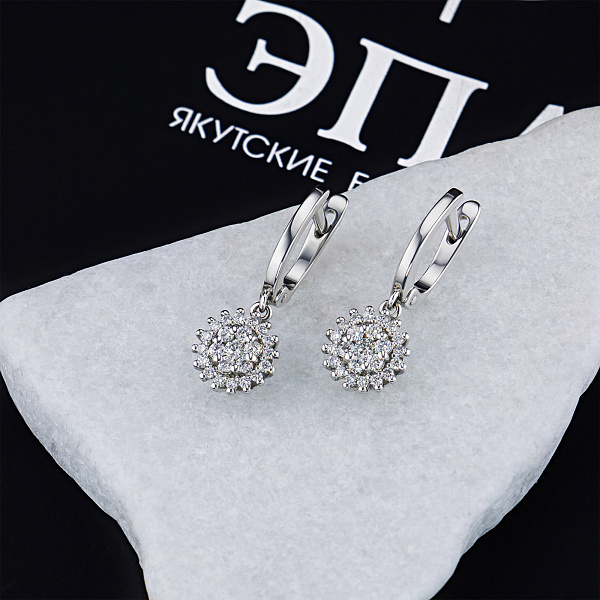 Обеци с диаманти е страхотно допълнение към Вашата колекция бижута. Продава се на цената на производителя (BGN 6,163.00). Бижута с истински якутски диаманти, изработени в завода EPL в Якутск. Бяло злато подчертава играта на светлината върху страните на диаманта, устойчив е на влага, подходящ за ежедневно носене. Нашите продукти се продават само в маркови магазини.